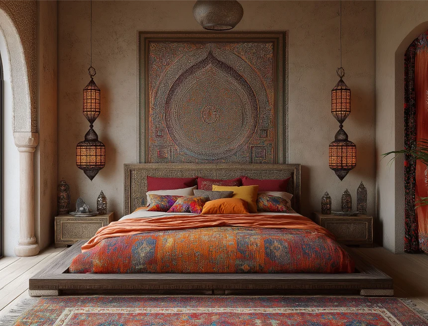 The style blends geometric tilework, carved wood detailing, and ornamental metal lighting to create spaces that feel rich in character and cultural depth.